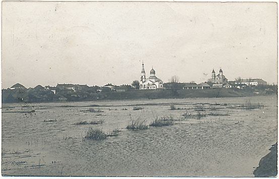 Włodawa, 1912 rok. Od lewej widoczne trzy tutejsze świątynie: synagoga, cerkiew prawosławna i kościół katolicki