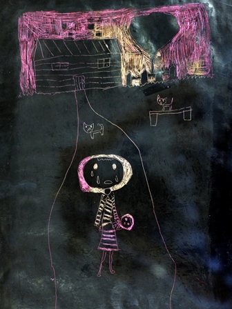 Praca Anastazji Gromadzkiej (7 lat) najmłodszej uczestniczki konkursu. Tak wyobraża sobie moment wyjazdu wsi jej prababci w bieżeństwo; kobieta z dopiero co urodzonym dzieckiem nie zdecyduje się na wyjazd