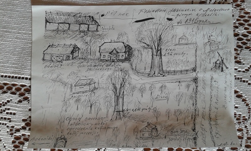 Imam Stefan Mustafa Jasiński: Pamiętam moje rodzinne Malawicze. Na jednym końcu, za drogą, stał młyn [spalił się w 2011 roku – AP-O]. Tu rozchodziły się drogi prowadzące do różnych miejscowości. Także do Knyszewicz, z których Pani pochodzi. Niemal naprzeciwko, na początku wsi, przy drodze do Bohonik, była nasza siedziba. Na wjeździe stał ogromny klon, miał 1,5 metra grubości. Był widoczny aż z ostatniej góry pod Krynkami. To była duża posiadłość – proszę zobaczyć, narysowałem to, co pamiętam sprzed wyjazdu. Naszkicowałem z pamięci, nie było zresztą kogo już dopytywać.