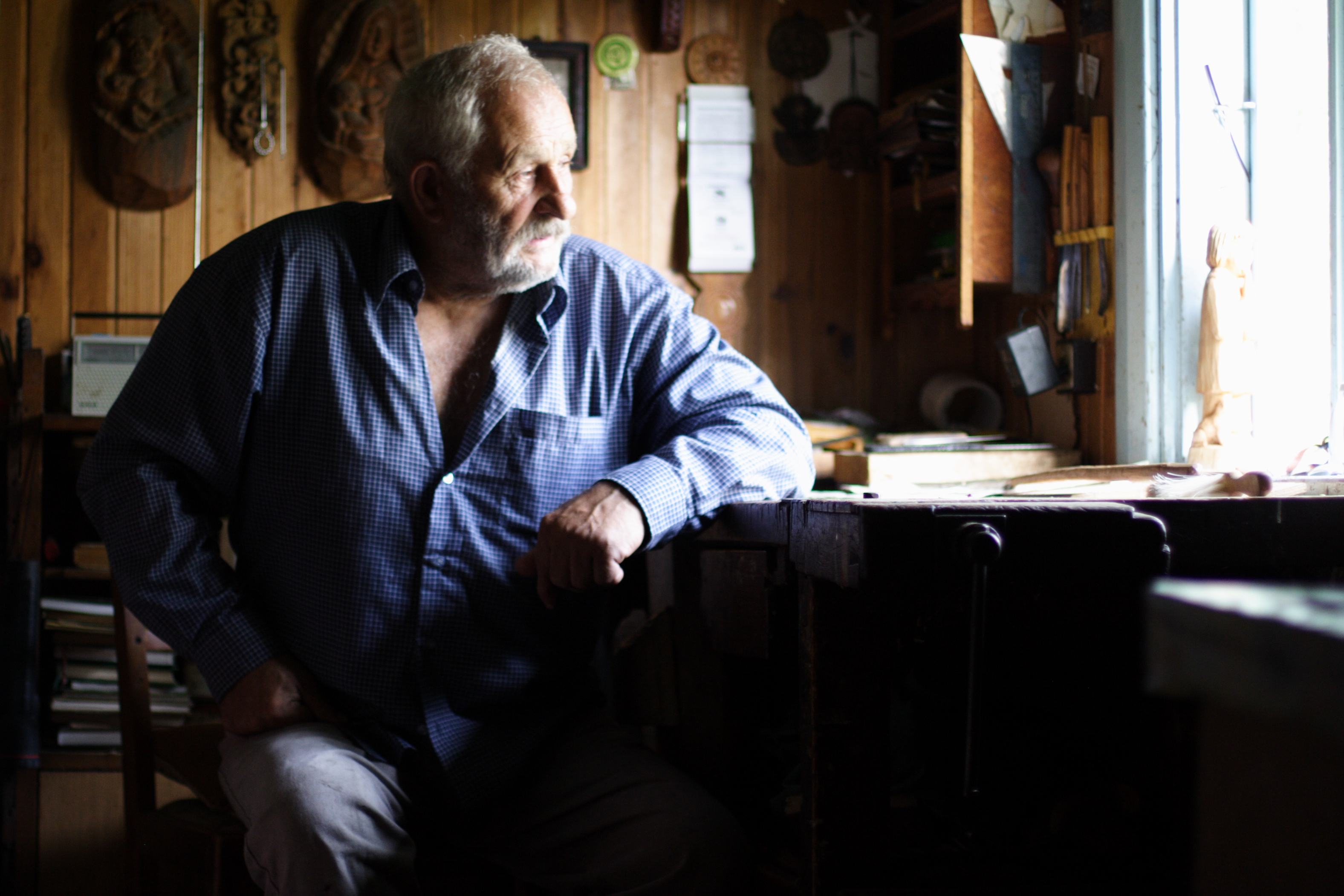 Włodzimierz Naumiuk w pracowni, urządzonej w domu, który przetrwał bieżeństwo; fot. Aneta Prymaka-Oniszk