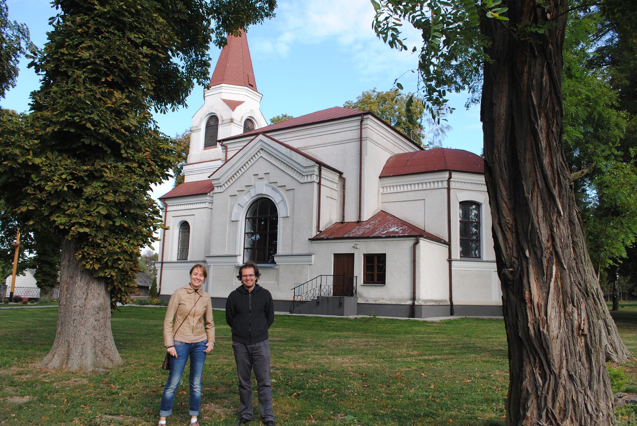 Myrosława Kotorowicz i Mariusz Sawa (autor przedmowy,który odnalazł, przetłumaczył i spopularyzował wspomnienia ks. Kotorowicza) przy świątyni w Hostynnem