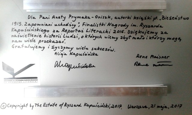 Najpierw nominacja, potem finał, wreszcie wielka gala. Tyle niezwykłych rzeczy spotkało „Bieżeństwo 1915” i jego autorkę w związku z Nagrodą im. Ryszarda Kapuścińskiego za Reportaż Literacki… Ciekawych spotkań, odkryć, inspiracji. Historię uchodźców 1915 roku usłyszały tysiące osób. „Jak to się stało, że dotychczas o tym nie słyszeliśmy?” – pytali mnie podczas spotkań wokół nagrody.